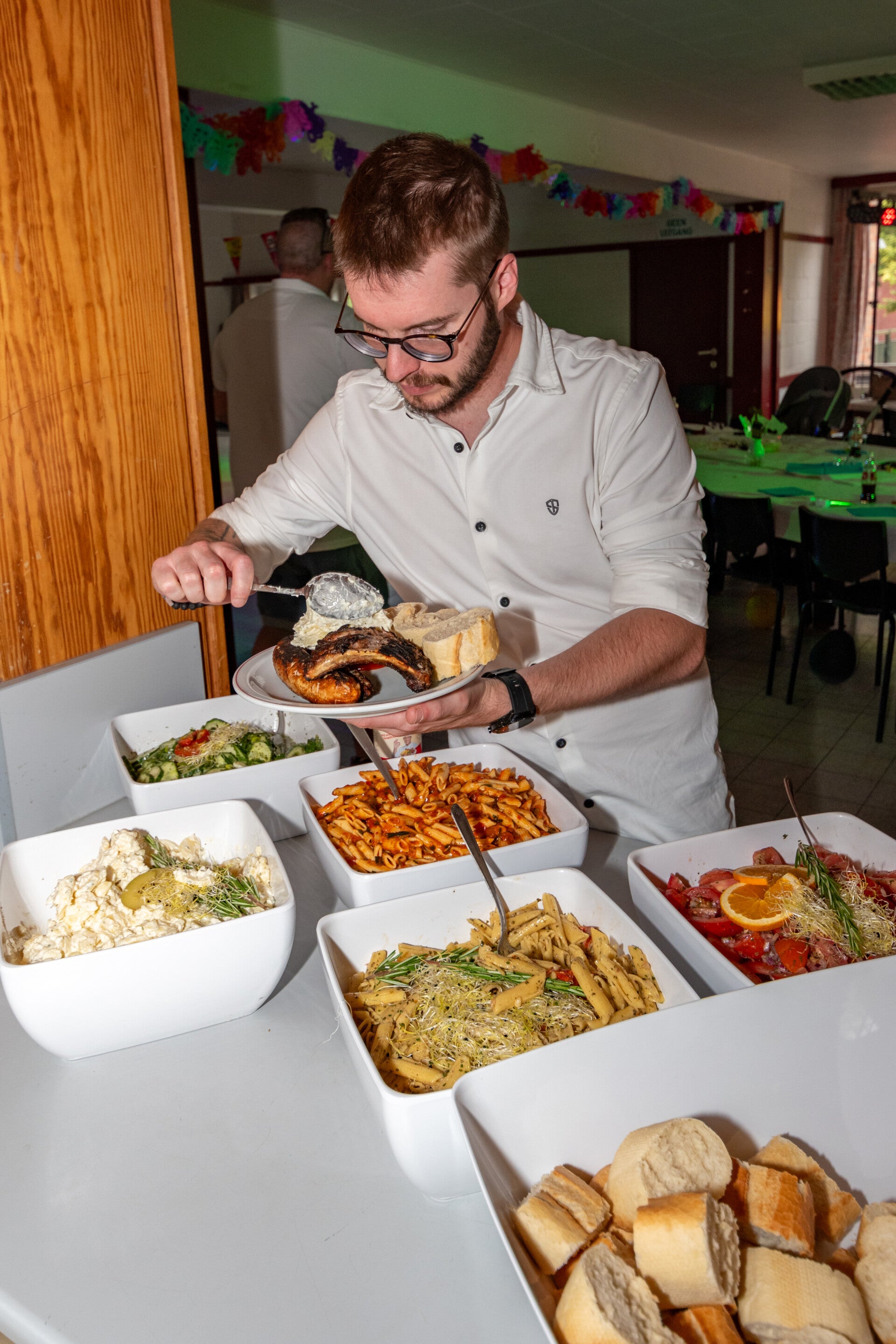 De parochie zaal van Zutendaal kreeg een warme, stijlvolle uitstraling die perfect paste bij dit bijzondere jubileum. De gasten werden ontvangen in een sfeervolle setting, genoten van heerlijke hapjes, verfijnde drankjes en een feestelijk dessertbuffet.