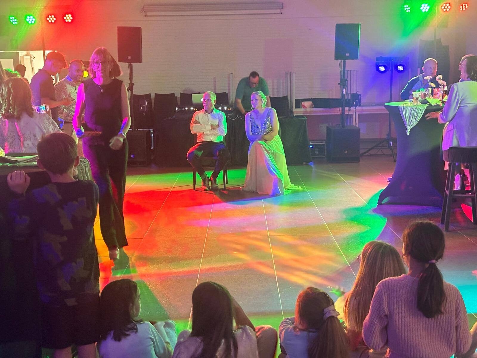Voor het huwelijk van Emmy & Tim mochten wij de zaal volledig aankleden en uitlichten, zodat alles meteen die warme en feestelijke sfeer uitstraalde. De tafels werden stijlvol gedekt en de gasten genoten van heerlijk eten, drankjes en een uitgebreid dessertenbuffet. Na het officiële gedeelte barstte de afterparty los met onze DJ, en werd het een avond vol plezier en onvergetelijke momenten voor het koppel en hun gasten.